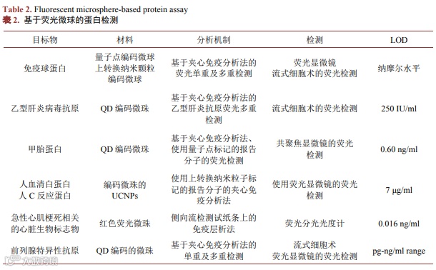 荧光微球基的蛋白质检测通常基于夹心免疫测定法,其中目标分析物首先被传感探针捕获,然后使用荧光报告分子进行识别。这种能够提供高特异性和灵敏度,适用于多种应用场景(表2)。