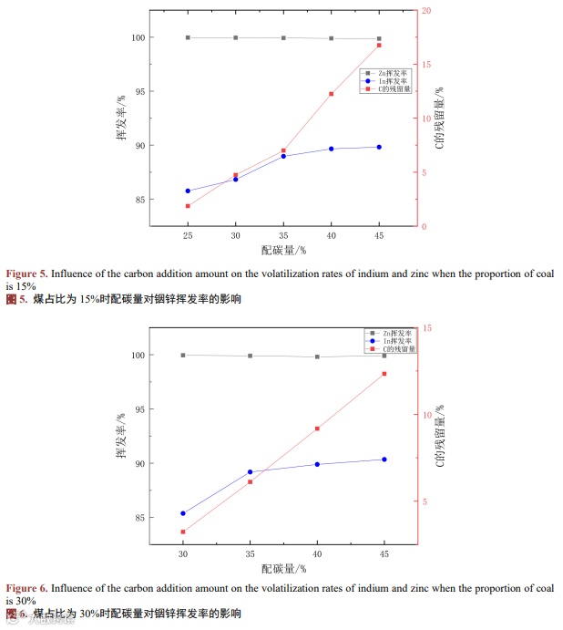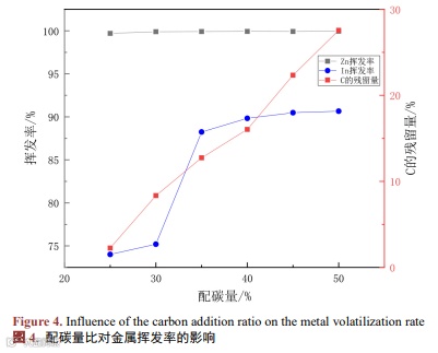 在原料25 g,反应温度1250℃,反应时间1 h,还原剂为全焦粉,考察在密闭环境下配碳量对锌铟挥发的影响,结果如图4所示。