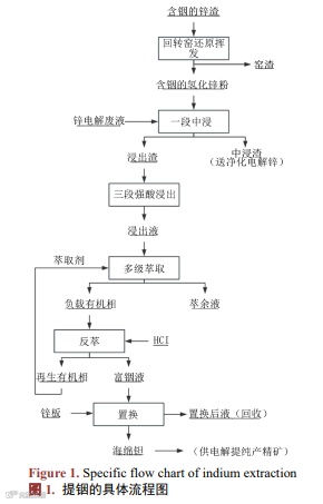 在湿法炼锌工艺中,对锌精矿的焙砂进行中性浸出时,中锌残渣富集了锌矿中的铟,是综合提铟的最主要的原料。从含铟的锌残渣中提铟的具体流程图如图1所示。