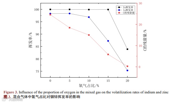 在原料25 g,反应温度1250℃,反应时间1 h,还原剂占比为35%且为全焦粉,持续通入氧气与氩气的混合气体,考察混合气体中氧气占比对锌铟挥发的影响,结果如图3所示: