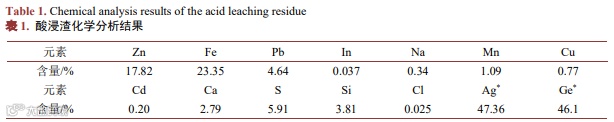 1) 国内某厂的锌精矿经过湿法冶炼后的锌酸浸渣中物相主要为氧化锌,铁酸锌与硅酸锌,主要呈单体形式产出。其中Zn、In含量分别为17.82%和0.037%,具有回收价值。