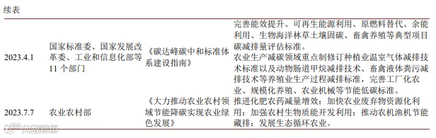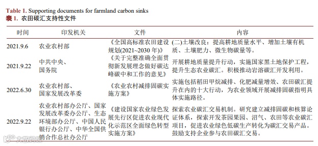 目前我国已有多项政策出台,引导农业领域开展减排固碳工作,提高农田生态系统固碳能力。相关农田碳汇支持性文件如下表1所示: