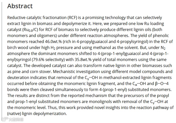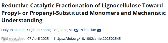 近日,相关研究成果以Reductive Catalytic Fractionation of Lignocellulose Toward Propyl- or Propenyl-Substituted Monomers and Mechanistic Understanding为题,发表在《德国应用化学》上。研究工作获得国家自然科学基金委员会和科学技术部的支持。