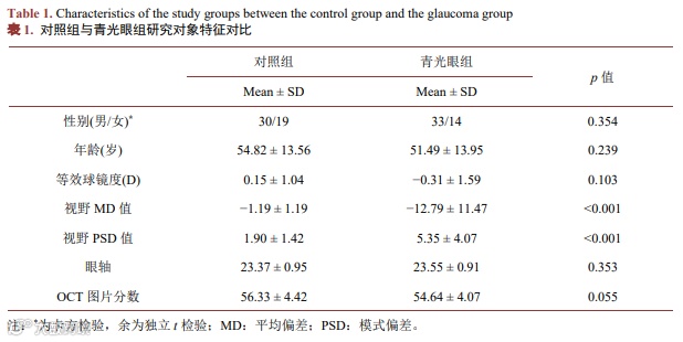 总体人群纳入标准:1) 年龄18岁以上;2) 最佳矫正视力 ≧ 0.5;3) 球镜度数绝对值 ≤ 6.00 D,柱镜度数绝对值 ≤ 3.00 D。4) 无眼底病史、视神经疾病史或眼内手术史等可能导致视盘神经纤维改变的相关疾病。对照组附加标准:连续2次测量NCT眼压 ≤ 21 mmHg,眼底检查扫描未发现异常及视野检查结果在正常范围内。青光眼组附加标准:特征性的视神经损害(视盘上下方局限性盘沿变窄,垂直径杯盘比增大,或形成切迹;双眼杯盘比差值 > 0.2)或特征性的视野缺损(旁中心暗点、鼻侧阶梯、弓形暗点等改变)。排除标准:OCT图片质量差,分数 < 45分或无法配合检查、不愿意参加此项研究者。