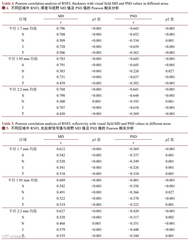 RNFL光反射信号值与厚度一样,在青光眼患者视盘周边各区域中均较对照组有所降低,且与视野MD及PSD参数相关联,在一定程度上体现了青光眼的RNFL损伤程度及区域性改变,或许可以作为一个补充指标用于青光眼的辅助诊断及随访。