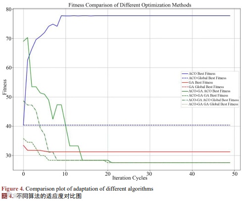 在联合算法中,蚁群算法在初期承担主要的搜索功能,其作用相比单独使用蚁群算法更为高效。通过引入启发式信息作为探索的主导因素,蚁群算法在初期能够遍历更多的可行解空间。相较于单独的蚁群算法,这种联合策略利用遗传算法提供的初始解与全局信息,有效地减少了盲目搜索的范围,并加快了收敛速度。启发式信息的引导使得蚂蚁能够优先探索高潜力区域,从而提高了解的质量,为后续的迭代提供了良好的基础。与单一算法对比,蚁群算法不收敛,而结合遗传算法可以收敛并且可以得到更优的解。不同算法的适应度对比如图4所示。