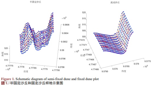 2022年8月,在对科尔沁沙地开展综合考察后,沿地形(包括迎风坡、背风坡、丘顶和丘底)在研究区域西缘典型的半固定沙丘(119˚65'29''E, 43˚02'53''N)和流动沙丘(119˚63'91''E, 43˚02'69''N)上设立调查样地(图1),调查样地大小分别为40 × 160 m和40 × 148 m。进一步将样地细分为多个4 × 4 m的小样方,半固定沙丘划分为370个,流动沙丘划分为400个。对小样方内固沙灌木盐蒿个体的基本信息进行调查,调查内容包括灌木的地理坐标、生长发育阶段、株高、东西和南北冠幅大小。对地理坐标的测定选用GPS-PTK定位仪(南京鼎吉测绘仪器有限公司,S86T,精度为2 cm)测定。将灌木分为4个生长发育阶段:幼株(Y)、营养株(N)、生殖株(R)以及死株(D)。一方面,由于样地中死株数量较少,另一方面,死株个体死亡的原因和其所处的生长阶段差异较大,如不同阶段的个体均会由干旱、病虫害、啃食等原因致死。因此,本研究在进行空间点格局分析时未对死株进行分析。