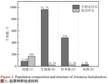 1) 半固定沙丘上盐蒿个体数量高于流动沙丘,且各生长发育阶段个体间结构差异显著。半固定沙丘上生殖株和营养株数量较多,标志着该群落结构趋于稳定,属于典型的稳定型群落。流动沙丘内幼株个体占优势,种群拥有良好的更新与恢复能力,属于增长型种群。