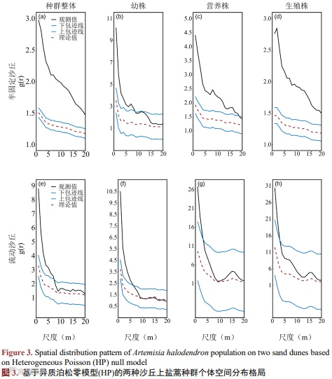 2) 半固定沙丘上,在剔除生境异质性的异质泊松模型下,除幼株在中等和较大尺度上呈现随机分布外,无论是种群整体还是不同生长阶段的种群,在0~20 m的尺度范围内大都表现为聚集分布。流动沙丘上的盐蒿种群,无论是种群整体还是不同生长发育阶段的盐蒿种群,都表现为小尺度聚集,中等和较大尺度上随机分布的特点。相较于半固定沙丘,生境异质性对流动沙丘上盐蒿种群空间分布格局的影响更为显著,从而更能深入揭示盐蒿种群在流动沙丘上空间分布格局形成的内在机制。