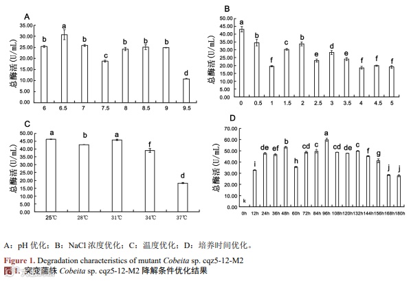 以发酵液培养基为出发培养基,对培养基组分及培养条件进行优化,包括NaCl浓度、最适pH值、最适温度和发酵时间。除考察发酵时间因素外,其余条件的发酵时间均为72 h将培养得到的Cobetia sp. cqz5-12-M2种子液离心收集、洗涤后按5%接种量分别接种至相应发酵液体培养基中,150 r/min,30℃进行培养,培养结束后,4℃、8000 r/min、5 min离心,分别收集发酵上清液和菌体沉淀,利用DNS法分别测定发酵上清液和菌体沉淀酶活。以上述得到的最优发酵条件分别发酵培养原始菌株和突变菌株。培养结束后收集上清液和菌体沉淀测酶活,以比较原始菌株和突变菌株在最优发酵条件下的总酶活差异。