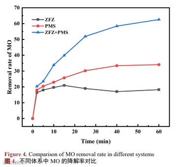 制备的ZFZ的催化性能通过不同体系中MO的降解率进行对比评价,见图4。