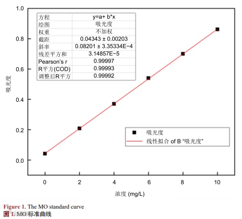 分别配制浓度为0、2、4、6、8、10 mg/L的MO溶液,在波长为464 nm的条件下检测溶液的吸光度,记录数据并绘制散点图,拟合得到MO的标准曲线,y = 0.04343 + 0.08201x,R2 = 0.99997,见图1。