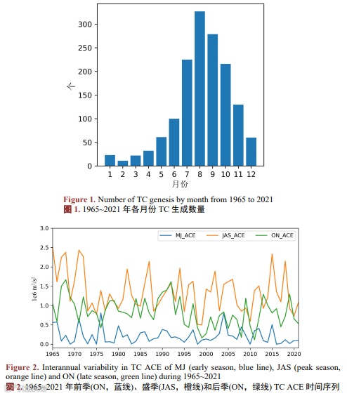 WNP是全球最主要的TC生成区,由于靠近西太暖池,背景海温较高,该海区是全球唯一在全年各月份都有TC生成的海区。1965~2021年各月份TC生成数量如图1,图2展示了各季节的TC 累积能量(ACE)的年际变化时间序列。
