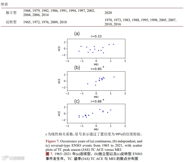 用P1、P2时期盛季MEI指数回归850 hPa风场和涡度场异常,如图5所示。两个时期ENSO事件的差别在于P1时期ENSO事件多为连续型ENSO,而P2时期连续型ENSO事件的比例明显降低(图6)。我们对1965~2021年之间所有的ENSO事件进行了分类,分为独立型、连续型、反转型三类(表1),并对三类事件中TC ACE与MEI指数进行统计。结果显示,连续型ENSO事件的TC盛季,TC ACE与MEI并无显著相关关系(图7(a))。而独立型、反转型ENSO事件的TC盛季,TC ACE与MEI有显著的相关(图7(b, c))。这进一步印证了P1时期TC ACE与MEI相关性较差的现象。