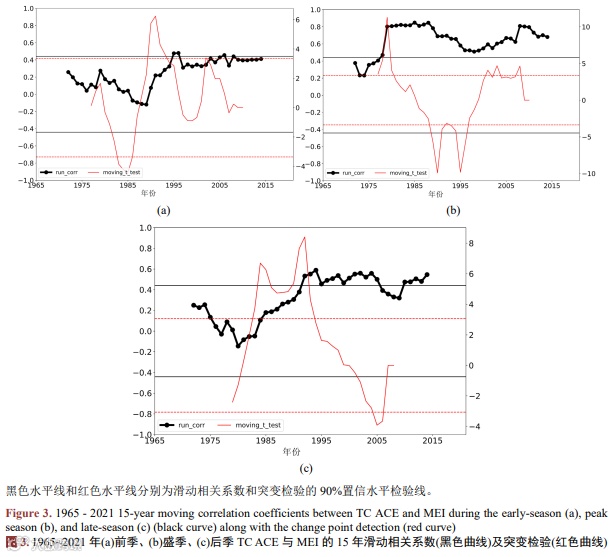 从不同季节来看,前季TC ACE在过去57年中并没有与ENSO发生显著相关的时段(图3(a))。盛季TC ACE时间序列和ENSO在1980年之前并不存在显著的相关性,1980年之后二者相关系数达显著超过90%的显著性检验。对1965~2021二者15年滑动相关系数序列做滑动t检验能在1979年看到显著的突变点(图3(b)),因此确定年代际突变点为1979年。后季TC ACE与MEI指数的相关关系也存在明显的年代际变化,具体表现为1965~2021年后季MEI指数和WNPTC ACE指数的15年滑动相关系数在1990年附近由不显著相关转为显著正相关。对二者15年滑动相关系数序列做滑动t检验能在1990年看到显著的突变点(图3(c))。