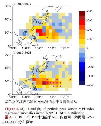 1)WNP TC盛季(7~9月份),ACE与ENSO的相关性在1980年发生了年代际的突变。1980年之前,TC ACE与MEI没有显著的线性相关关系,1980年之后TC ACE与MEI指数呈显著的正相关关系。TC后季(10~11月份),ACE与ENSO的相关性在1990年前后发生了年代际的突变。1990年之前,TC ACE与MEI没有显著的线性相关关系,1990年之后TC ACE与MEI指数呈显著的正相关关系。