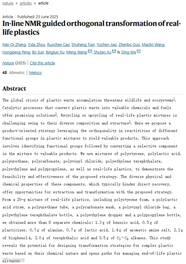 面对这一长期存在的技术瓶颈,马丁团队另辟蹊径,开发出名为“正交转化”的策略。他们的秘诀在于:运用先进的核磁共振技术,像为混合废塑料“做体检”一样,精准识别出其中各种关键的化学结构单元。接着,根据这些结构单元的不同化学“性格”,量身定制“化学反应套餐”,有步骤、分批次进行精确转化。最终,这套巧妙的流程成功地将来自实际生活的复杂混合塑料废弃物转化成多种高附加值的化学品。