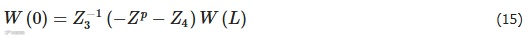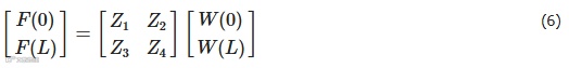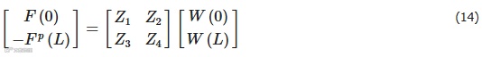 式中,F和W为直管两端状态向量,Zi (i = 1, 2, 3, 4)为4 × 4矩阵。