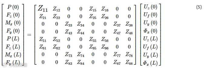 据ISM传递矩阵与阻抗矩阵之间的关系,左端为力状态向量,右端为位移状态向量,得到管路轴向阻抗矩阵: