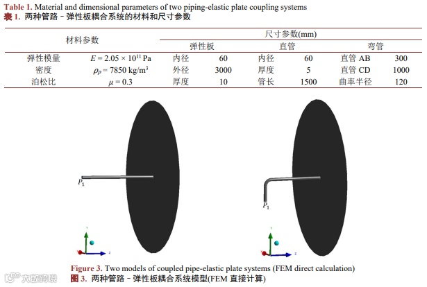 为验证本文ISM-FEM混合计算方法的正确性,与直接FEM计算结果对比分析,两种管路–弹性板耦合系统有限元模型如图3所示。直管、弯管总长度相同,管路和弹性板材料均为20号钢,具体尺寸和材料参数如表1所示,有限元软件中管壁和弹性板均采用壳单元,管内流体采用声学单元,网格尺寸均为0.02 m,流体和结构绑定接触,管路弹性板刚性连接,管口外部流体区域为轻流体,水的流体声学体积模量和密度分别为K = 2.14 × 109 Pa和ρf = 1000 kg/m3,水中声速为c0 = 1500 m/s,计算频率为1~1000 Hz,分析步长为1.0 Hz。