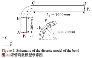 弯管采用离散方法,根据弯头处的连续性,将90˚直角弯管离散3段直管,弯管离散模型如图2所示。