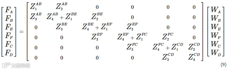 式中,F包括力和力矩,W包括位移和转角,Zij (i = 1, 2, 3, 4; j = AB, BE, EF, FC, CD)为4 × 4矩阵,弯管系统的阻抗矩阵为24 × 24矩阵。