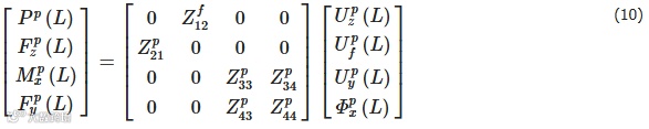 对轴向振动方程和yoz平面横向振动方程均采用分离变量法,以轴向振动式(1)为例,管路两端(z = 0, z = L)的轴向振动传递矩阵可以写为