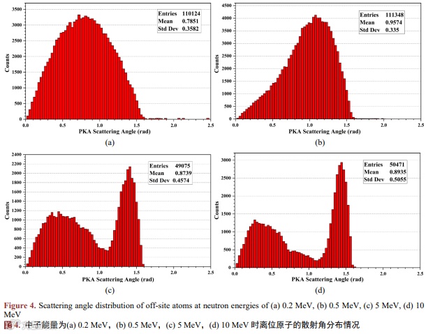 为了分析离位原子散射角不连续分布的原因,本文分别模拟计算了能量为0.2 MeV、0.5 MeV、5 MeV、10 MeV的中子入射产生的离位原子的散射角分布情况。由图4可知,当入射中子能力较低时,其在Ga2O3材料中主要是发生弹性散射,散射角连续分布,而随着入射中子能量的增加,弹性散射逐渐减弱,非弹性散射作用逐渐加强,导致散射角的分布不再是连续分布。