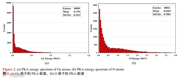 中子在Ga2O3中的输运过程中会与Ga、O原子发生弹性碰撞,导致Ga原子与O原子发生离位,形成了空穴。本文模拟了5 × 106个不同能量的中子辐照Ga2O3,产生数万个PKA。如图2所示是Ga原子和O原子PKA能谱分布图。