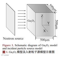 本文模拟了微米尺度下的Ga2O3材料的辐照损伤情况,粒子源是采用的连续中子能谱,能量分布从10 eV~20 MeV,Ga2O3材料厚度是500 μm× 500 μm × 500 μm,本次Geant4建模几何结构如图1所示。