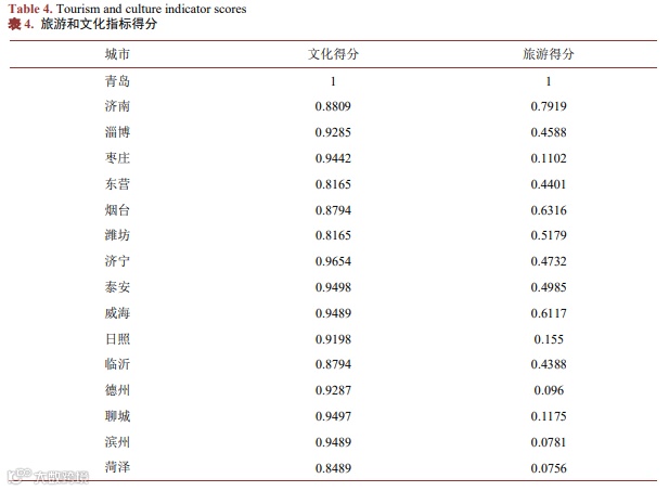 构建山东省内文化和旅游产业耦合协调发展的评价指标体系,对收集山东省数字经济、文化产业和旅游产业的相关数据进行处理和分析。基于信息熵的概念,分别对旅游和文化的数据进行归一化处理,计算其各指标的权重,然后计算综合得分,揭示文化和旅游产业在数字经济背景下的发展态势和相互关系。熵值法的结果如表4所示,各城市在文化和旅游方面的表现存在差异。