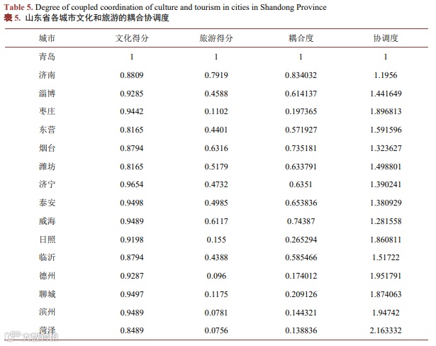 山东省各城市的文化与旅游耦合协调度差异较大。见表5,青岛在文化和旅游的融合度与协调性上表现最佳,达到最优状态,成为其他城市的典范。