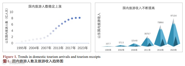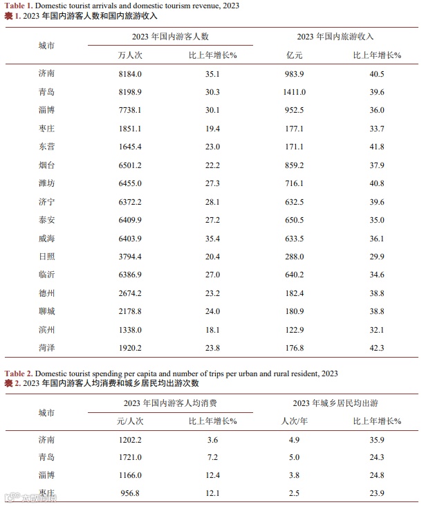 国内旅游人数及旅游收入趋势见图1。见表1,2023年山东省的国内旅游市场展现出强劲的增长势头,特别是济南和青岛的表现尤为突出。见表2,在2023年山东省各城市的旅游市场表现出积极的趋势,特别是在国内游客人均消费和城乡居民出游人次方面。