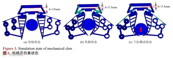 如图3(a)所示为机械手的初始状态,被抓物体悬置于机械手中间。此时滑块上表面与电机支座距离为15 mm (h = 15mm)。如图3(b)所示为机械手夹紧物体时的状态,通过滑块向上运动9.5 mm (h减小9.5 mm),机械手向内合拢,柔性体适应物体形状,形成包络。如图3(c)所示为被抓物体的下拉测试状态,机械手保持包络状态不变,控制被抓物体向下运动,直至被抓物体与手指脱离接触。