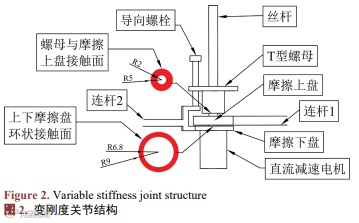 关节原理图如图2所示。当需要开启变刚度机构时,T型螺母在直流减速电机的驱动下,在导向螺栓的引导下,由旋转运动转变为上下运动。当需要锁紧关节时,T型螺母下压,使摩擦上盘与摩擦下盘接触,产生静摩擦扭矩,阻碍摩擦盘的转动。在静摩擦扭矩的作用下,与上下摩擦盘相连的连杆1和连杆2之间的角度α暂时固定,从而实现关节固化,抵抗外力。