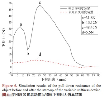 如图6所示,物体处于下拉状态时,比较变刚度机构未开启与开启后的下拉数值。当未开启变刚度装置时,物体下拉过程中所受的最大阻力为5.5 N;而开启变刚度装置后,物体下拉过程中所受的最大阻力为48.45 N,二者相差近8.8倍。由此可见,机械手在添加变刚度装置后,承载能力有显著提升。