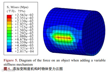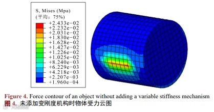如图4和图5所示,分别为未添加变刚度机构和添加变刚度机构时,被抓物体被夹紧时的应力云图。从图中可以看出,添加变刚度机构对物体的柔性夹取影响较小。