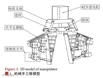 图1展示了简化后的刚柔耦合机械手的三维模型。其运动原理如下:由42步进电机驱动丝杆,使伸缩机构沿丝杆轴向移动。机械手指通过连杆连接至伸缩机构,通过伸缩机构的上下移动,实现机械手的张合。