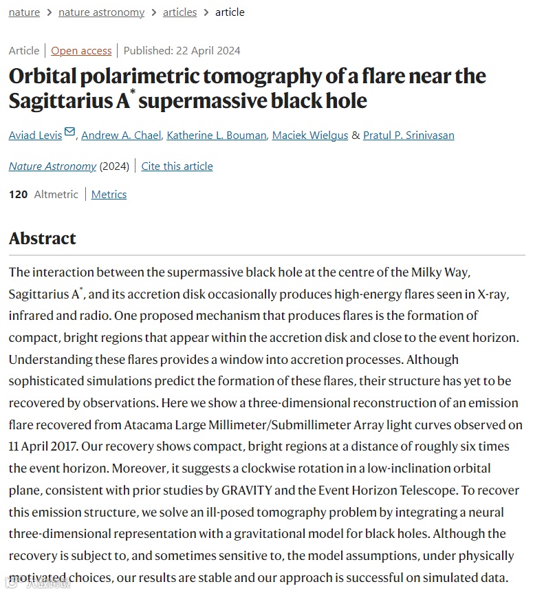 加州理工学院的Aviad Levis和同事提出了一种新的成像技术,与医学计算机断层扫描(也称CT扫描)中使用的技术类似,他们为其命名为“轨道偏振层析成像”。团队利用阿塔卡马大型毫米波/亚毫米波阵列(ALMA)在2017年4月11日的观测结果,研究了无线电波长的耀斑的3D外观。用这个数据集重建3D图像因为距离和亮度变化颗粒细节而存在困难,因而作者用一种基于神经网络的新计算机技术,这个神经网络受到黑洞的预测物理性质和电磁辐射过程的约束。