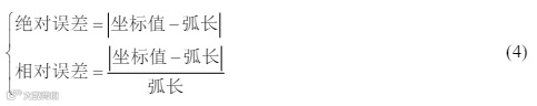 为了验证椭球高斯投影相关理论与公式在火星的适用性,在椭球模型下计算地球与火星在赤道边缘的弧长和坐标值,并以绝对误差和相对误差的绝对值作为衡量精度的标准,其中绝对误差和相对误差的绝对值的定义如下。