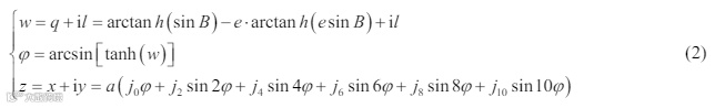 以实数表示的高斯投影公式推导过程复杂,表示形式也比较复杂,边少锋、李厚朴等推导出了子午线弧长与等量纬度之间的关系式,并将其拓展至复数域,以此为基础导出了高斯投影复变函数正解的非迭代公式: