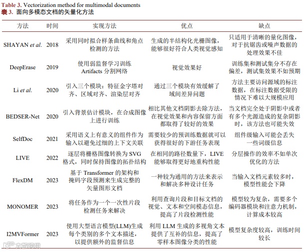 文档矢量化是自然语言处理(NLP)中的一个重要技术,它可以将文本数据转换为数字形式,以便计算机能够理解和处理,因此在文本分类、信息检索、文本摘要、文本相似度比较、机器翻译、语义分析等领域十分重要。表2展示了基于深度学习的不同矢量化方法的优缺点。表3展示了面向多模态文档的不同矢量化方法的比较。
