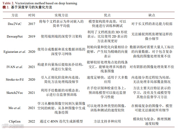 文档矢量化是一种将文档内容转化为数学向量表示的技术,一般来说就是将光栅图像或者栅格图像转换为矢量图像。通过矢量化,可以将文本数据转化为计算机可以理解和处理的形式,从而将文档资料通过计算机矢量化的格式(例如OFD,PDF等)完整地保存下来,为印刷过程中的文本处理、信息检索等领域提供了更多可能性。首先,介绍了文档矢量化的背景;其次,介绍了传统文档矢量化模型;然后,将传统方法到基于深度学习的方法进行了全面综述并对不同的方法进行了比较;最后,对文档矢量化的应用领域和发展进行探讨和展望。