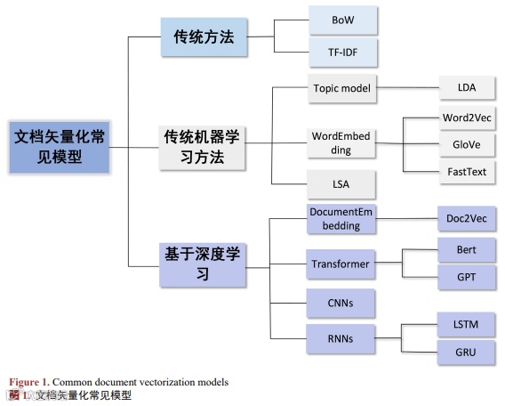 文档矢量化模型通过使用自然语言处理(NLP)和机器学习技术将文档或文本转换为向量,按照传统方法、基于机器学习的文档矢量化方法和基于深度学习的文档矢量化方法进行分类,图1展示了文档矢量化的常见模型。表1是各种文档矢量化模型的比较。