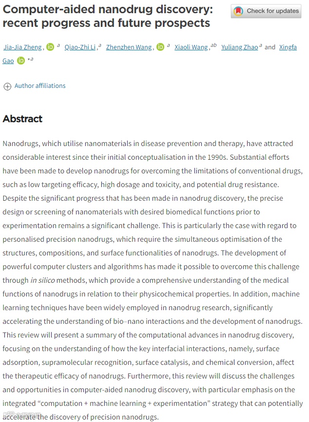纳米材料因独特的物理化学特性,在疾病预防和治疗方面展现出潜力。然而,面对众多的纳米材料种类和复杂的纳米-生物界面相互作用,实现具有特定生物医学功能的纳米材料的精准设计和筛选面临挑战。计算机集群和算法的快速发展为实现这一目标提供了契机。该研究探讨了计算机辅助医用纳米材料发现的潜力,强调了计算方法在揭示纳米材料与生物分子间关键界面相互作用如表面吸附、超分子识别、表面催化和化学转化等方面的重要意义。这些相互作用是决定纳米材料医学功能的关键因素。同时,该团队研究了机器学习技术如何通过分析大量实验和计算数据来预测纳米材料的医学功能,为个性化精准医疗提供了新途径。这种跨学科的创新整合可以加速医用纳米材料的研发进程,为未来精准纳米药物的设计和筛选提供技术支持,实现更高效、更安全的治疗方式以满足临床治疗的个性化需求。