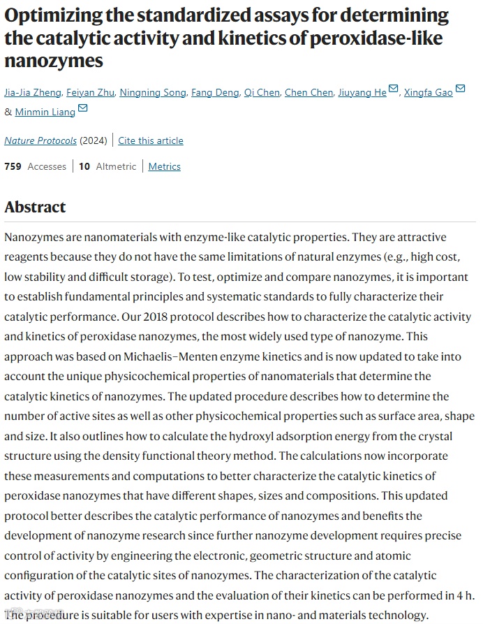 纳米材料的类酶催化活性是其生物医学应用的关键特征。为了促进具有类酶催化活性的医用纳米材料的发展,需要精确调控其活性位点的几何和电子结构,以优化催化活性和底物选择性。因此,对这类纳米材料的催化活性和动力学特性的准确表征变得至关重要。为此,高兴发团队与北京理工大学梁敏敏团队合作,提出了改进的标准化方法。这一方法结合传统酶的米氏动力学和纳米材料的理化性质,能够更准确地描述不同形状、尺寸和组分的类过氧化物酶纳米材料的动力学活性。该方法有助于全面评估不同类酶催化纳米材料的酶学特性,对推动这些医用纳米材料在实际应用中的发展具有重要意义。考虑到现有的催化活性测定技术以及活性位点数量与表面积的测量技术已相对成熟,这种优化的表征方法有望在纳米医学领域得到更广泛的应用,为设计和筛选具有特定生物医学功能的纳米材料提供实验支持。