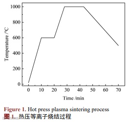 使用10目的标准筛将磨球和球磨40 h的合金粉末分开,将合金粉末放置在SPS-100T-20-III放电等离子热压烧结炉中烧结成直径为30 mm圆柱形块体。烧结过程中保持恒定压力为1 t,烧结工艺如图1所示,经10 min从室温升到600℃,保温10 min;再经8 min升温到1000℃,保温15 min后冷却到室温,烧结过程如图1所示。
