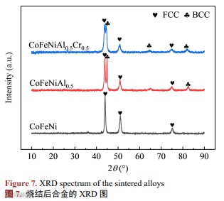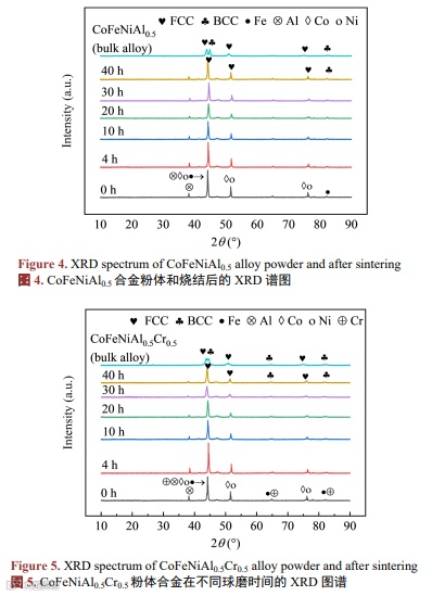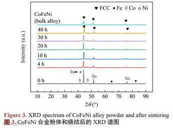 图3是CoFeNi合金粉体在不同球磨时间以及烧结后块体合金的XRD谱图。CoFeNiAl0.5合金粉体在球磨过程及烧结后块体合金的XRD谱图如图4所示。CoFeNiAl0.5Cr0.5合金粉体在不同球磨时间及烧结后块体合金的XRD图谱如图5所示。图7为烧结后块状高熵合金的XRD图谱。
