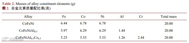 表2为三种高熵合金的元素质量配比,采用精确度为0.1 mg的FA2004电子天平称量金属粉体的质量。