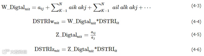 如公式(4-3)与公式(4-4)所示,本文采用完全消耗系数法测算的数字投入指标W_Digtalnit与DSTRIit交乘,构造核心解释变量DSTRIwnit作为基准回归的核心解释变量。同理,如公式(4-5)与公式(4-6)所示,将采用直接消耗系数法测算出的DSTRIznit作为核心解释变量替代指标,进行稳健性检验。
